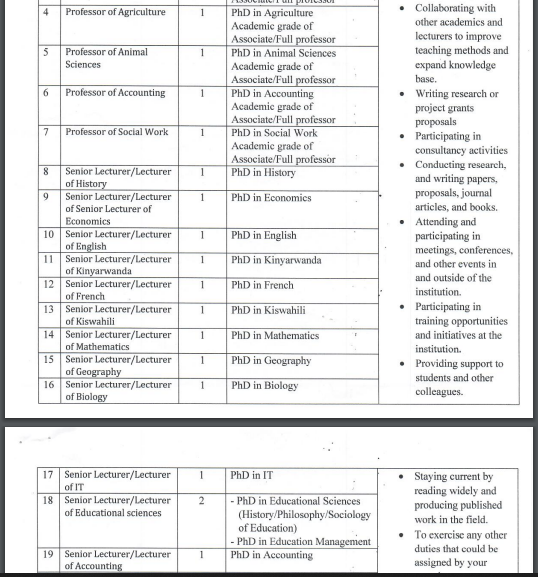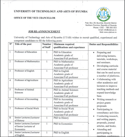 27 Job Positions (Re-Advertisement) at University of Technology and Arts of Byumba(UTAB): (Deadline 20 December 2024)