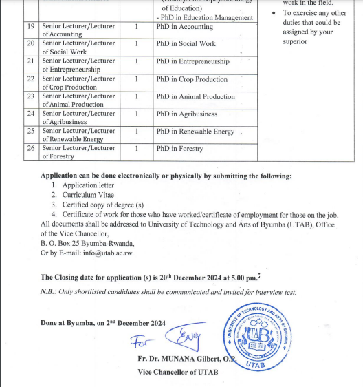 27 Job Positions (Re-Advertisement) at University of Technology and Arts of Byumba(UTAB): (Deadline 20 December 2024).
