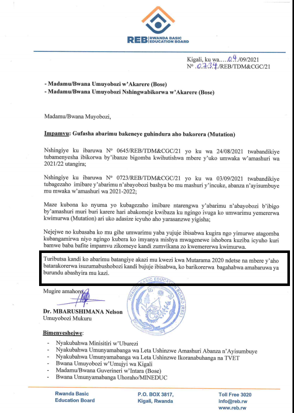 MU IBARUWA HARAGIRA HATI “TURIBUTSA KANDI KO ABARIMU BATANGIYE AKAZI MU KWEZI KWA MUTARAMA 2020 NDETSE NA MBERE Y’AHO BATARAKORERWA ISUZUMABUSHOBOZI KANDI BUJUJE IBISABWA ,KO BABIKORERWA BAGAHABWA AMABARUWA YA BURUNDU ABASHYIRA MU KAZI.“
