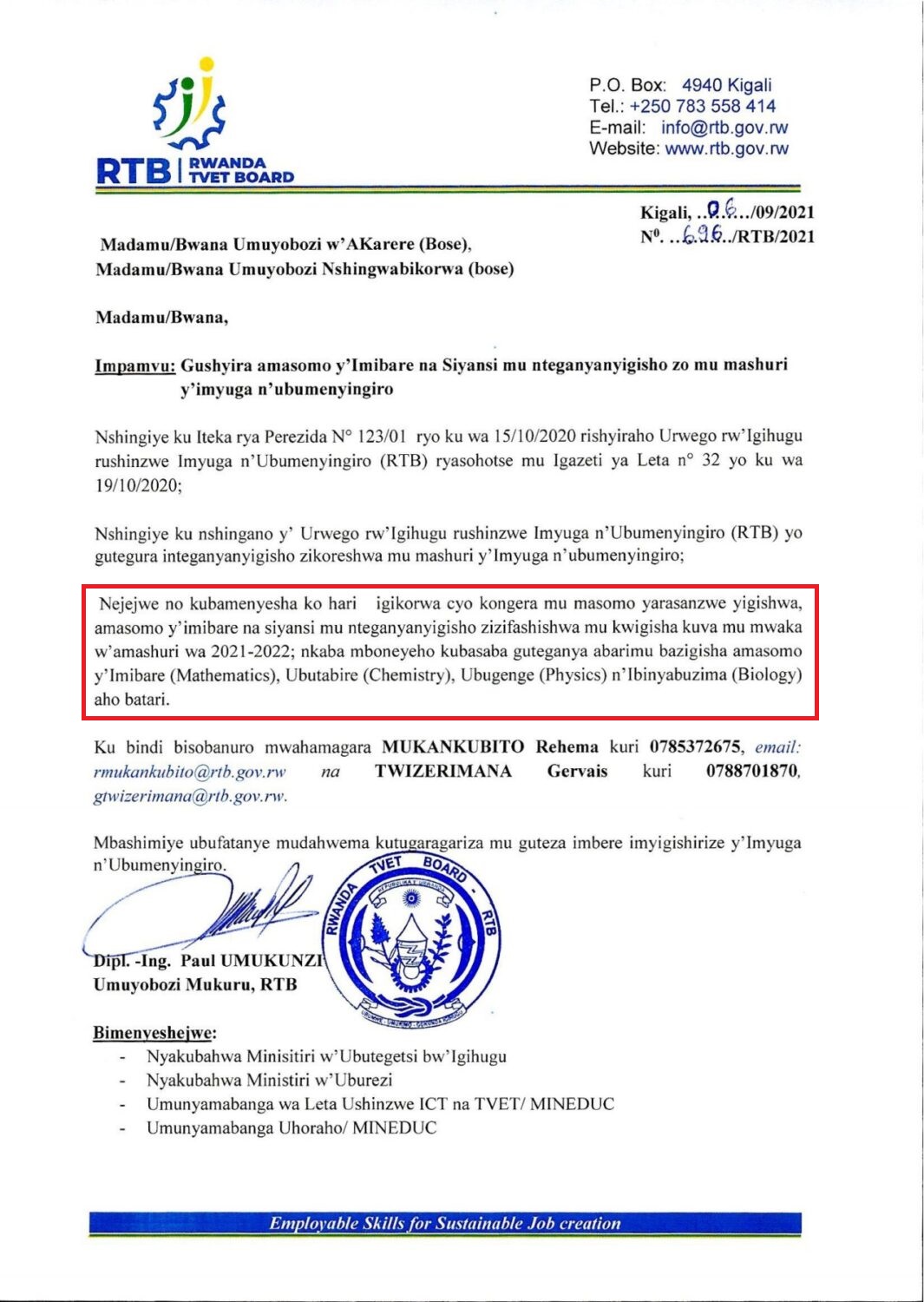 ABIZE IMIBARE NA SIYANSI (MATHEMATICS-PHYSICS-CHEMISTRY-BIOLOGY) BEMEREWE KUJYA KWIGISHA MU MASHURI Y’IMYUGA N’UBUMENYINGIRO.