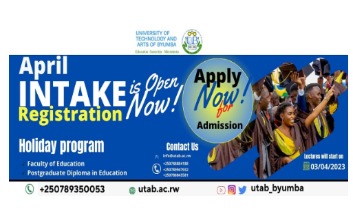 Bagize bati:” University Of Technology and Arts Of Byumba ( UTAB), iramenyesha abifuza kuyigamo muri gahunda y’ibiruhuko (Holiday Program) ko kwiyandikisha byatangiye bikazarangira ku itariki 2/4/2023 saa sita z’ijoro.Abarimu n’abandi bakora mu mashuri abanza n’ayisumbuye ndetse n’andi babyifuza bose barararitswe.Amasomo azatangira ku itariki 3/4/2023