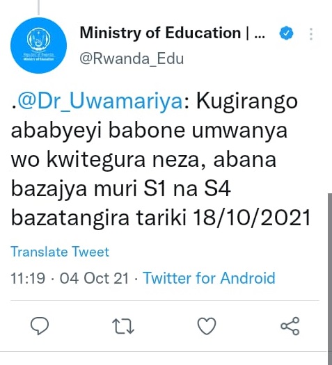 Minisiteri y’uburezi yashyize ahagaragara amatariki abanyeshuri ba S1 na S4 bazatangirira amasomo yabo mu rwego rwo kugirango ababyeyi babone umwanya wo kwitegura.