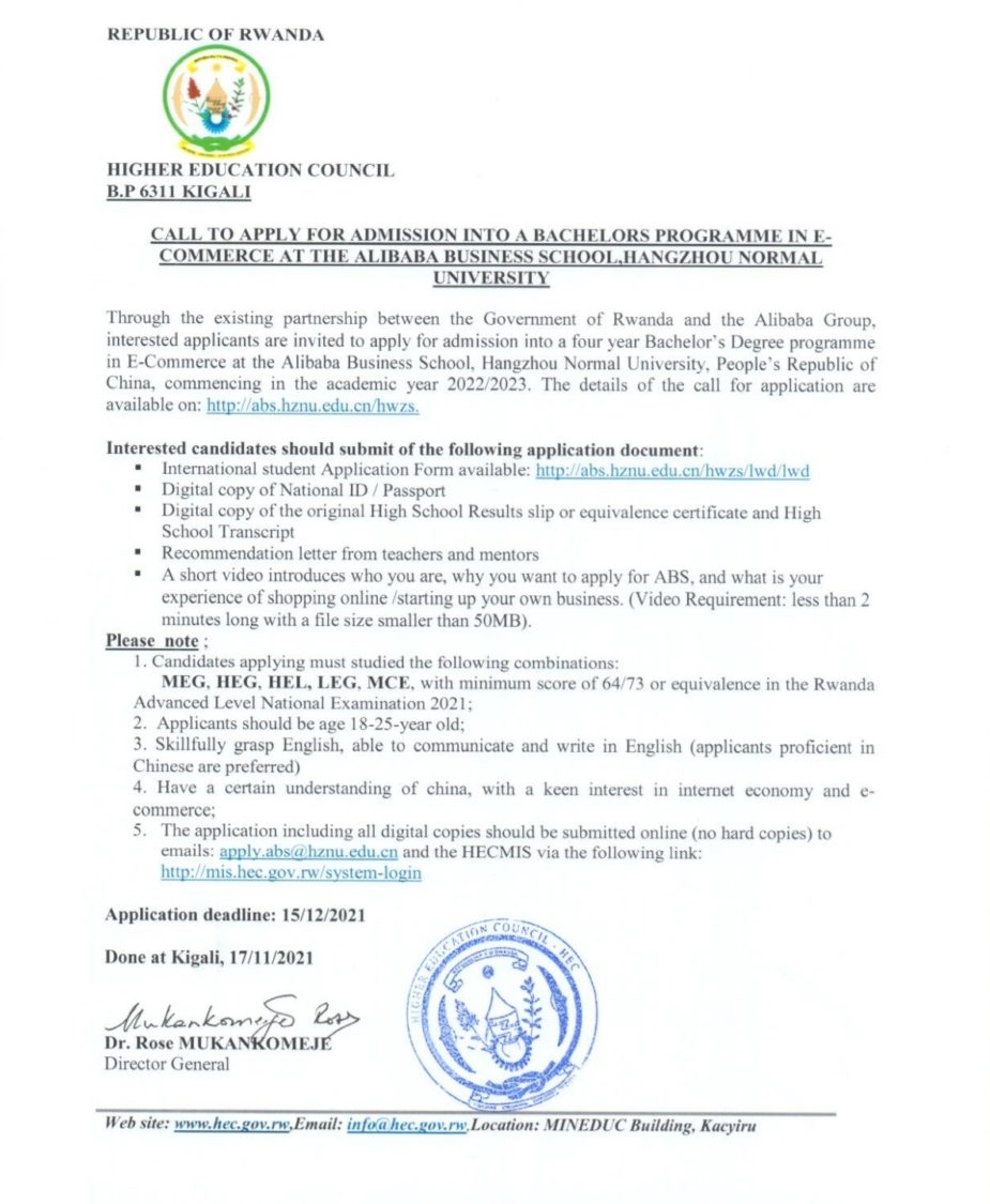 Through the existing partnership between the Rwanda Government and the Alibaba Group, interested applicants are invited to apply for admission into a four year Bachelor’s Degree program in E-Commerce at the Alibaba Business School, Hangzhou Normal University, People’s Republic of China, commencing in the academic year 2022/2023. The details of the call for application are available on: http://abs.hznu.edu.cn/hwzs.