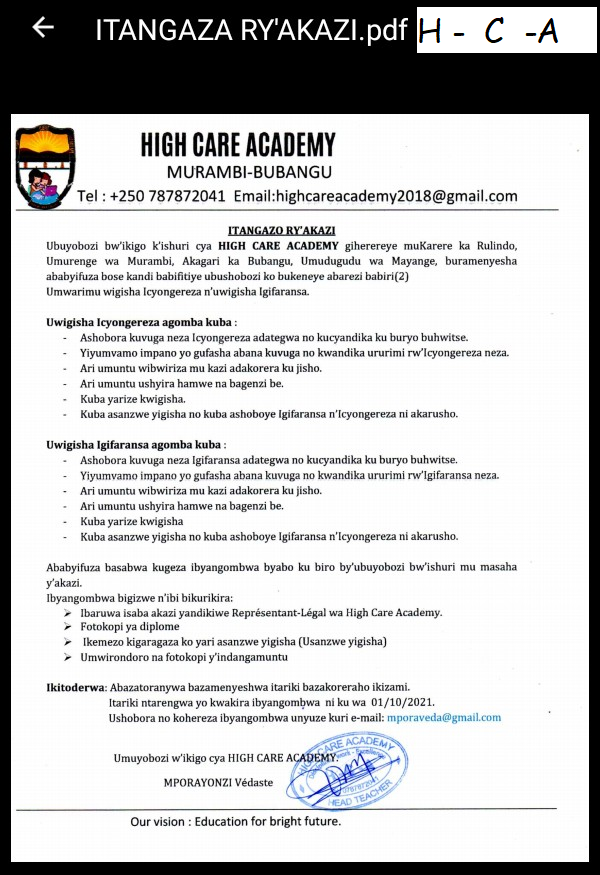 HomeBreaking NewsAnnouncement Announcement ENGLISH AND FRENCH TEACHER AT HIGH CARE ACADEMY By THE CEO September 23, 2021 0 492 FacebookTwitterPinterestWhatsApp HIGH CARE ACADEMY , akazi wasaba niba ushoboye kwigisha ICYONGEREZA cyangwa IGIFARANSA. Post Views: 513 TagsEducation Share FacebookTwitterPinterestWhatsApp Previous articleIKIZAMINI CYA REB CYO KWIMENYEREZA, UKO IKIZAMINI KIZAKORERWA ONLINE KIZABA GITEYE.Next articleMenya ibintu 10 wakora ngo ubeho usobanutse, uhorane umucyo mu byo ukora n’aho uri hose THE CEO Related Articles OPPORTUNITIES 🔥 Top 54 Most Profitable YouTube Niches in 2025 (Backed by Viewers & Trends) OPPORTUNITIES Helping a slow learner requires patience, understanding, and strategies tailored to their developmental level. Below is a comprehensive guide covering what slow learners are,... OPPORTUNITIES Smart Classes in Education: Transforming Student Learning in the 21st Century. LEAVE A REPLY Cancel reply Comment: Please enter your comment! Name:* Please enter your name here Email:* You have entered an incorrect email address! Please enter your email address here Website: Save my name, email, and website in this browser for the next time I comment. [td_block_social_counter facebook="tagdiv" twitter="tagdivofficial" youtube="tagdiv" style="style8 td-social-boxed td-social-font-icons" tdc_css="eyJhbGwiOnsibWFyZ2luLWJvdHRvbSI6IjM4IiwiZGlzcGxheSI6IiJ9LCJwb3J0cmFpdCI6eyJtYXJnaW4tYm90dG9tIjoiMzAiLCJkaXNwbGF5IjoiIn0sInBvcnRyYWl0X21heF93aWR0aCI6MTAxOCwicG9ydHJhaXRfbWluX3dpZHRoIjo3Njh9" custom_title="Stay Connected" block_template_id="td_block_template_8" f_header_font_family="712" f_header_font_transform="uppercase" f_header_font_weight="500" f_header_font_size="17" border_color="#dd3333"] - Advertisement - Latest Articles OPPORTUNITIES 🔥 Top 54 Most Profitable YouTube Niches in 2025 (Backed by Viewers & Trends) OPPORTUNITIES Helping a slow learner requires patience, understanding, and strategies tailored to their developmental level. Below is a comprehensive guide covering what slow learners are,... OPPORTUNITIES Smart Classes in Education: Transforming Student Learning in the 21st Century. OPPORTUNITIES A Smart School of the 21st Century goes beyond traditional education by integrating technology, innovation, and modern pedagogy to create a dynamic, student-centered learning... OPPORTUNITIES Gusobanukirwa, Kwemeza, Igenzura ry’Ibisuzumabumenyi: Kuki ari ingenzi mu Burezi bwiza Load more