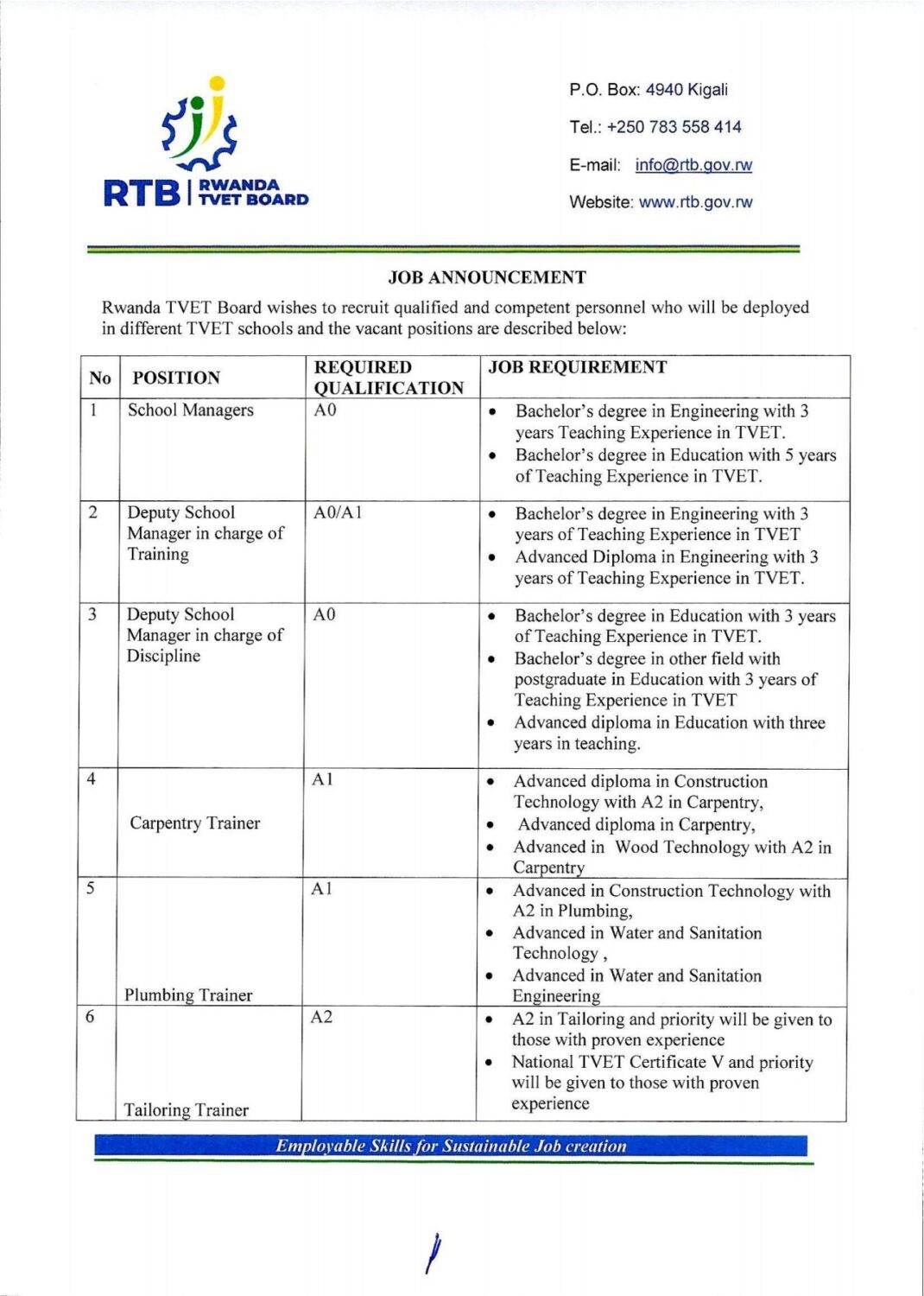 IMYANYA YO KWIGISHA MURI SECONDARY SCHOOLS KU BATARIZE UBUREZI BAFITE A2, A1 na A0