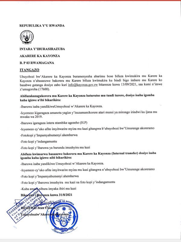 ITANGAZO KU BARIMU BIFUZA KUZA GUKORERA MU KARERE KA KAYONZA N’ABIFUZA KWIMURWA BASANZWE BAKORERA MU KARERE KA KAYONZA.
