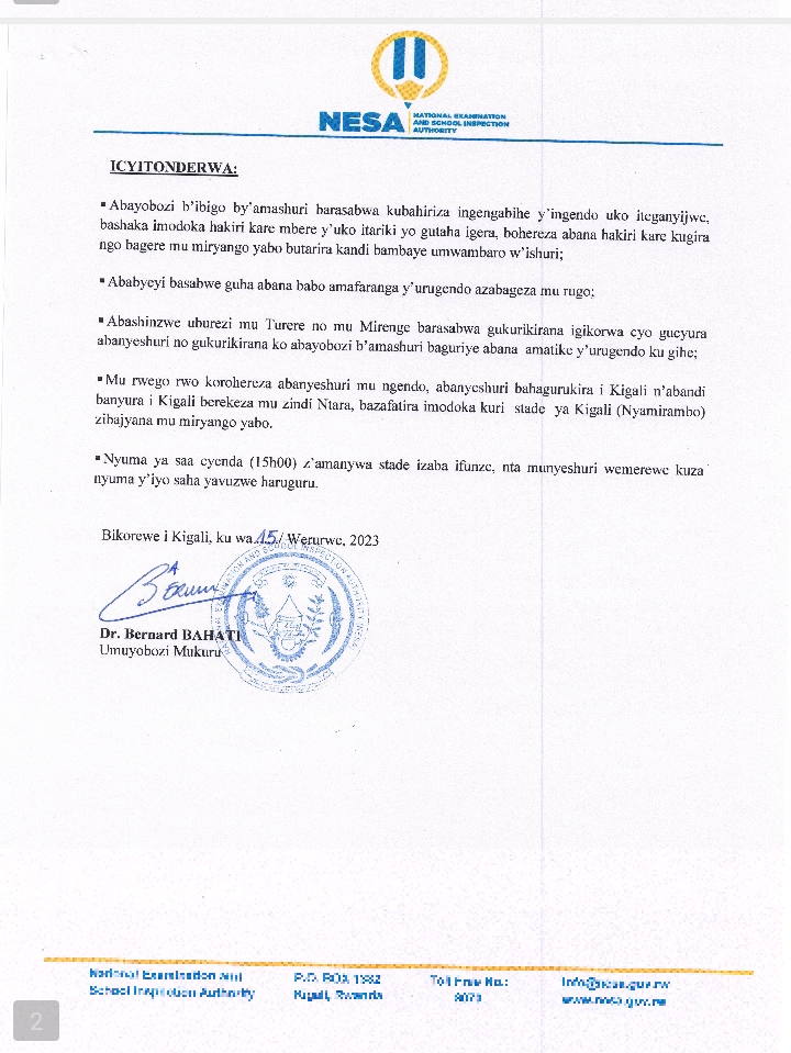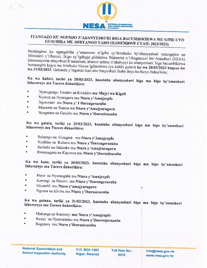 ITANGAZO KU NGENDO Z’ABANYESHURI BIGA BACUMBIKIRWA MU GIHE CYO GUSUBIRA MU MIRYANGO YABO IGIHEMBWE CYA II 2022/2023.
