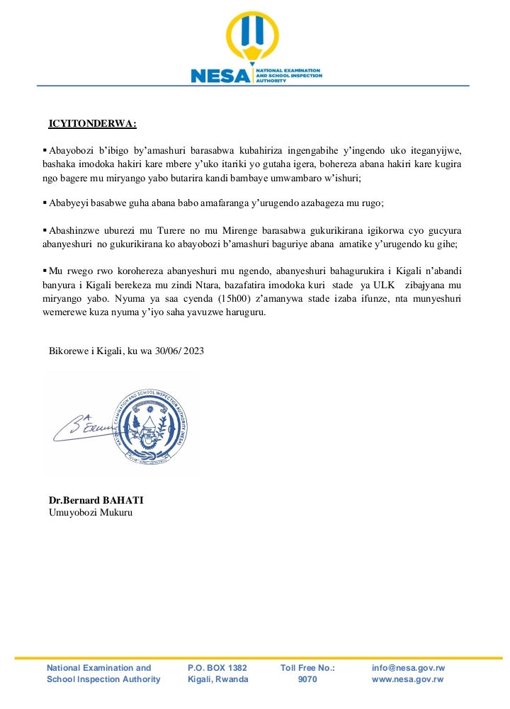 ITANGAZO KU NGENDO Z’ABANYESHURI BIGA BACUMBIKIWE MU BIGO.