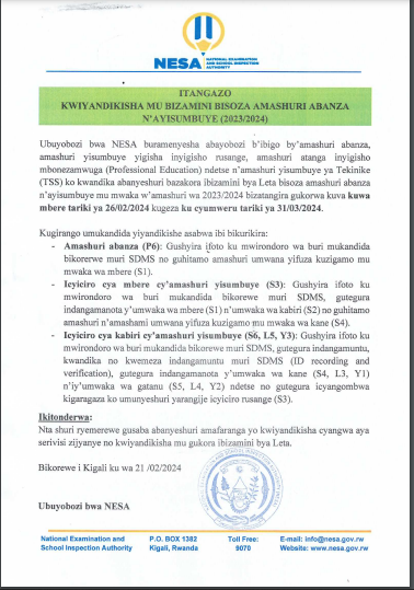 Home Breaking News Itangazo National Examination registration Secondary and Primary Breaking News Itangazo National Examination registration Secondary and Primary By THE CEO - March 1, 2024 0 86 FacebookTwitterPinterestWhatsApp DOWNLOAD THE DOCUMENT BELOW KORA IMYITOZO KU IKESHAMVUGO Results BackNext1. #12. Agati bavurugisha amata Inshyimbo Inkuyo Umutozo Umuceeri Previous Finish Itangazo__National_Examination_registration__Secondary_and_Primary__2_ Post Views: 629 BackNext RELATED ARTICLESMORE FROM AUTHOR ITANGAZO RIREBA KWINJIRA MURI POLISI Y’U RWANDA. Final_List_of_O_Level_Markers_2023 LESSON PLAN GENERATOR SOFTWARE FOR TEACHERS.