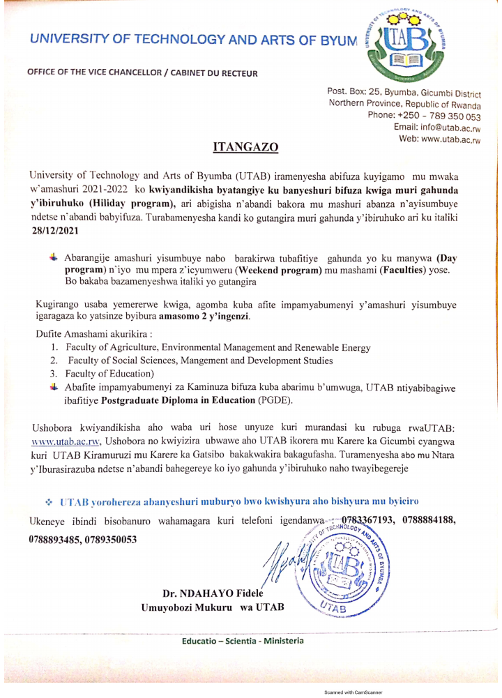 ITANGAZO RIGENEWE ABIFUZA KWIGA MURI UTAB BACHELOR’S MU MSHAMI ATANDUKANYE N’ABIFUZA POSTGRADUATE IN EDUCATION.