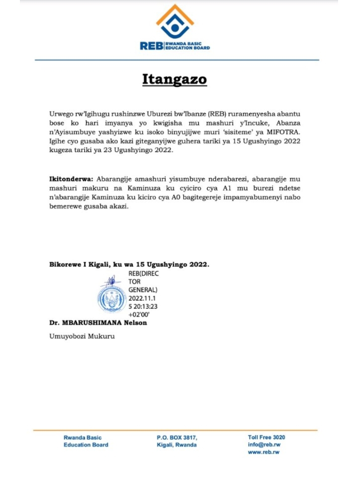 ITANGAZO RIREBA ABARANGIJE AMASHURI A2, A1 NA A0