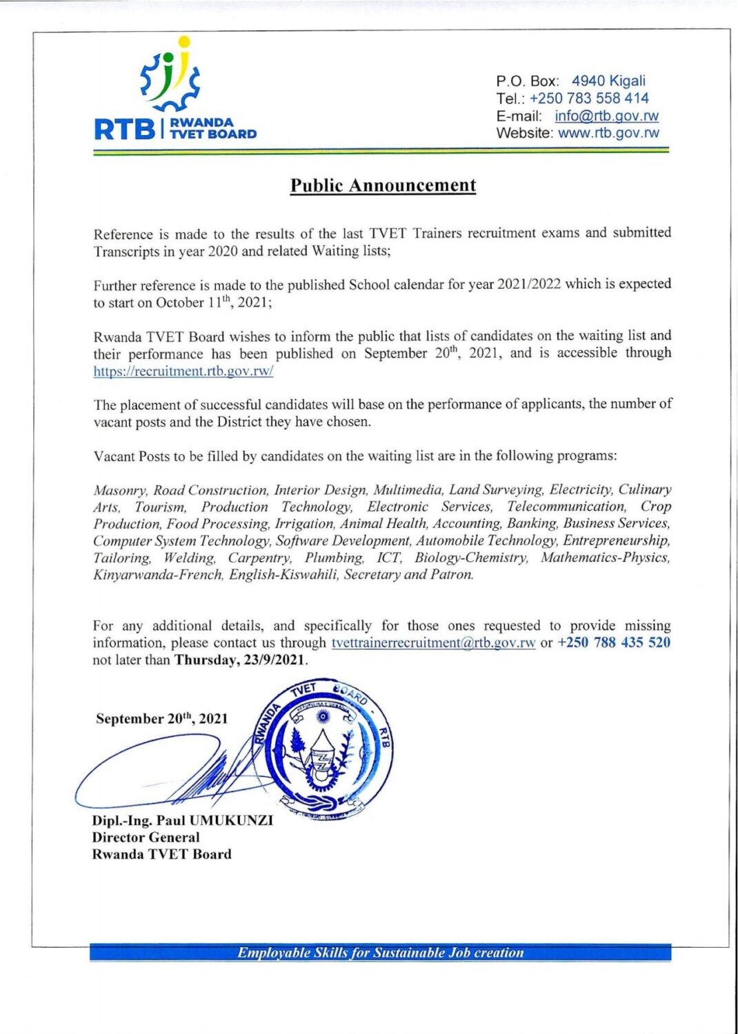 Rwanda TVET Board wishes to inform the public that lists of candidates on the waiting list and their performance has been published on September 20th, 2021, and is accessible through https://recruitment.rtb.gov.rw/