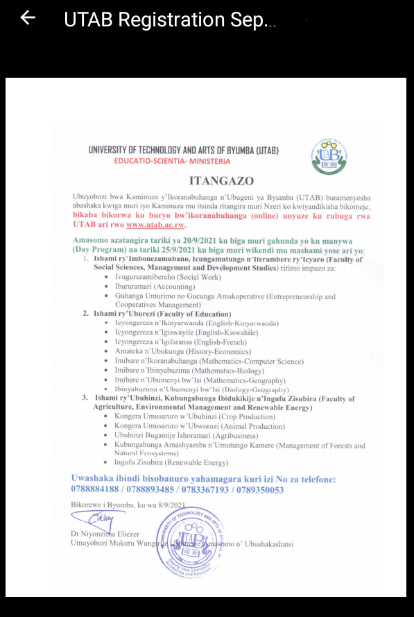 Ku bifuza kwiga ibijyanye n’Uburezi (Faculty of Education ); Imbonezamubano, Icungamutungo n’Iterambere ry’icyaro (Faculty of Social Science , Management and Development Studies) ; Ubuhinzi , Kubungabunga Ibidukikije n’Ingufu Zisubira (Faculty of Agriculture , Environmental Management and Renewable Energy ) muri UTAB amarembo arakinguye. Gutangira ni 20/09/2021 na 25/09/2021.