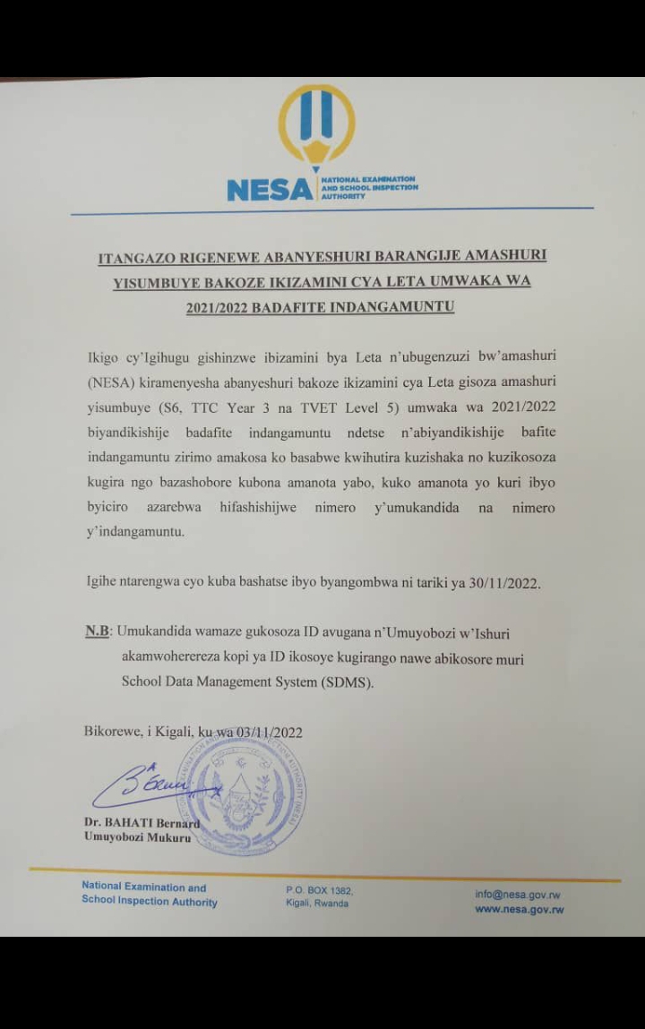 ITANGAZO RYA NESA RIREBA ABANYESHURI N’ABAYOBOZI.