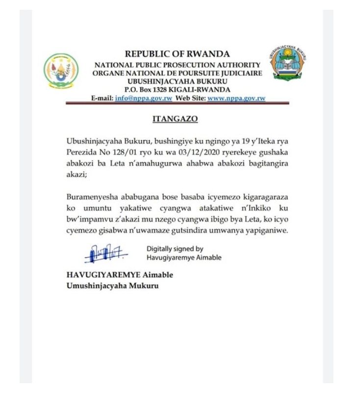 ITANGAZO RY’UBUSHINJACYAHA BUKURU RIGENEWE ABASHAKA ICYEMEZO CY’UKO BATAKATIWE N’URUKIKO.