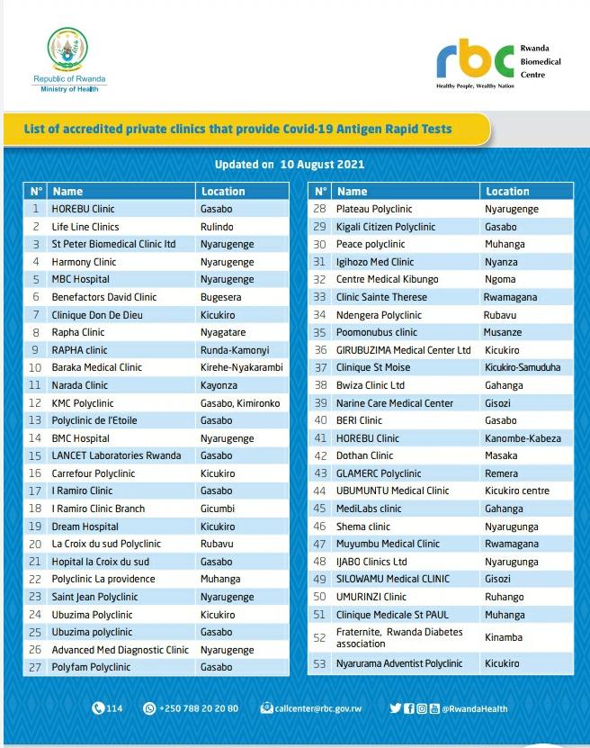 After reducing the cost of taking Covid-19 Antigen Rapid test, Rwanda Biomedical Center (RBC) has provided lists of accredited private clinics that provide Covid-19 Antigen Rapid test. The cost of Antigen Rapid Test is 5000Rwf.