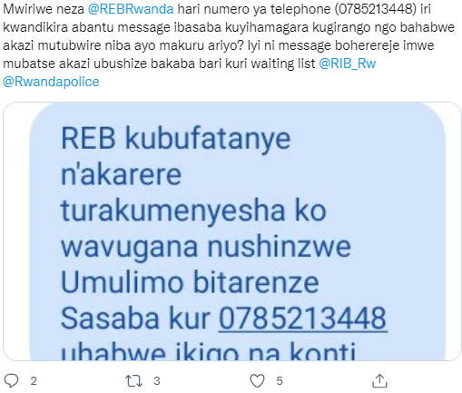 Ubutumwa bwa Joel NSHIMIYIMANA buragira buti”Mwiriwe neza @REBRwanda hari numero ya telephone (0785213448) iri kwandikira abantu message ibasaba kuyihamagara kugirango ngo bahabwe akazi mutubwire niba ayo makuru ariyo?