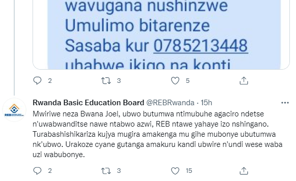 REB nayo yamusubije igira iti”Mwiriwe neza Bwana Joel, ubwo butumwa ntimubuhe agaciro ndetse n’uwabwanditse nawe ntabwo azwi, REB ntawe yahaye izo nshingano.