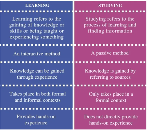 In summary, while studying is a specific and focused activity usually associated with academic tasks, learning is a broader and continuous process that encompasses various experiences and extends beyond specific goals. Studying is a part of the learning process, but learning also involves a deeper understanding, application, and integration of knowledge into one’s overall understanding of the world.