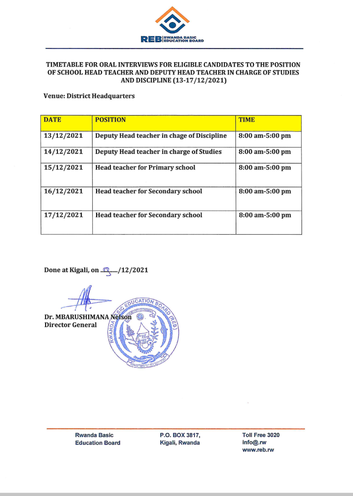 TIMETABLE FOR INTERVIEW FOR HEAD TEACHERS AND DEPUTY HEAD TEACHER IN CHARGE OF STUDIES.