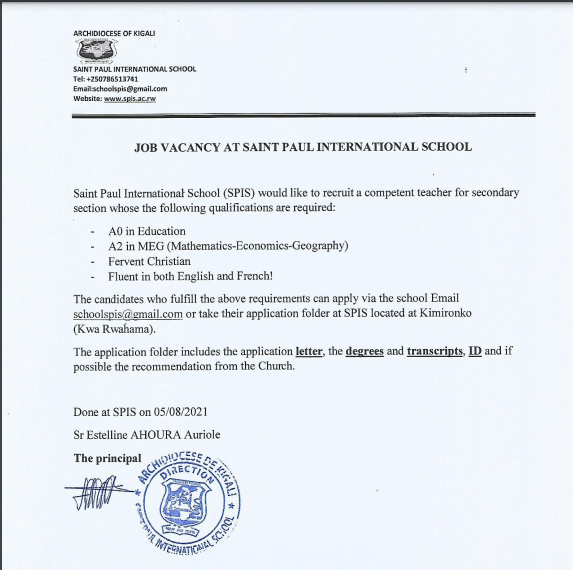 Saint Paul International School (SPIS) irifuza guha akazi umwarimu wa secondary ubifitiye ubushobozi kandi ashoboye akazi ko kwigisha.